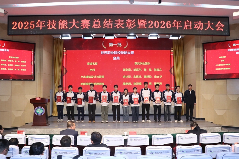 12月11日下午,学校2025 年技能大赛总结表彰大会暨2026年启动大会在高新校区博爱厅举行。大会全面总结了2025 年技能竞赛工作成效,表彰先进典型,部署2026年备赛任务,进一步凝聚全校共识,以赛促教、以赛促学、以赛促改,推动学校技能人才培养质量再上新台阶。校长韩小卫、副校长张学钢、祝和意出席大会,教务处、学生处等职能部门负责人,各二级院部负责人、实践教学管理人员,2025年世赛/省赛获奖师生代表,创新大赛获奖师生代表,第二十届技能大赛获奖集体代表,2026年备赛师生等参会,会议由教务处处长刘超群主持。